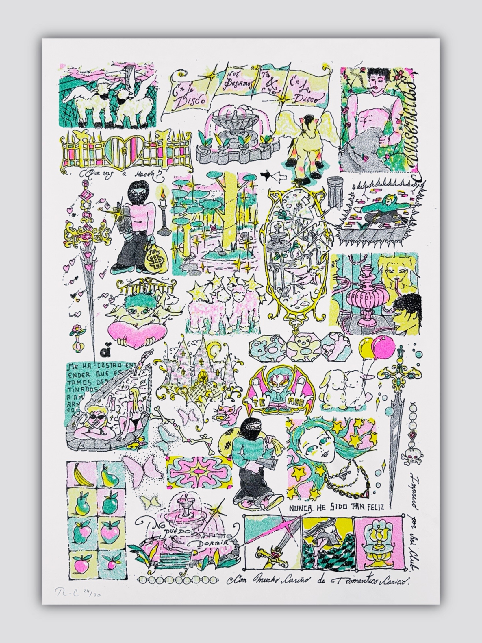 Ilustrado por Romántico Risografía de 4 tintas Edición de 30 copias firmadas Tamaño A3 (29,7 x 42 cm) Starwhite Archiva Smooth 148 gr
