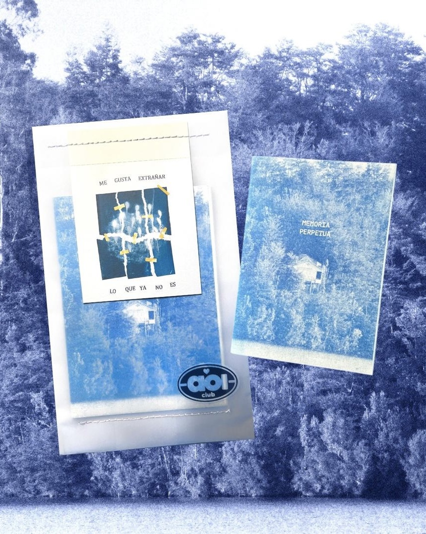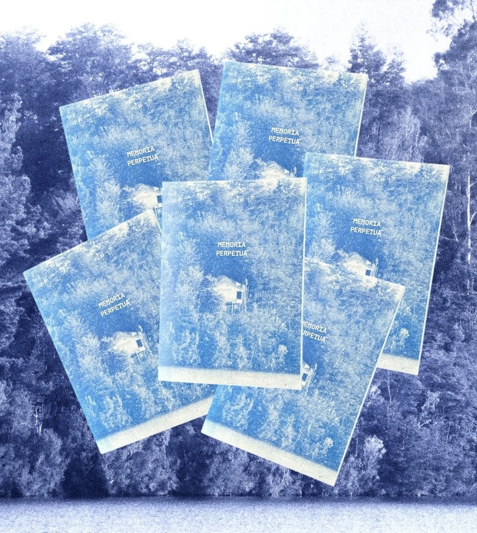 Fanzine de fotografías en cianotipia impreso en risografía en tinta azul. Empaque en papel vegetal con costura y postal coleccionable