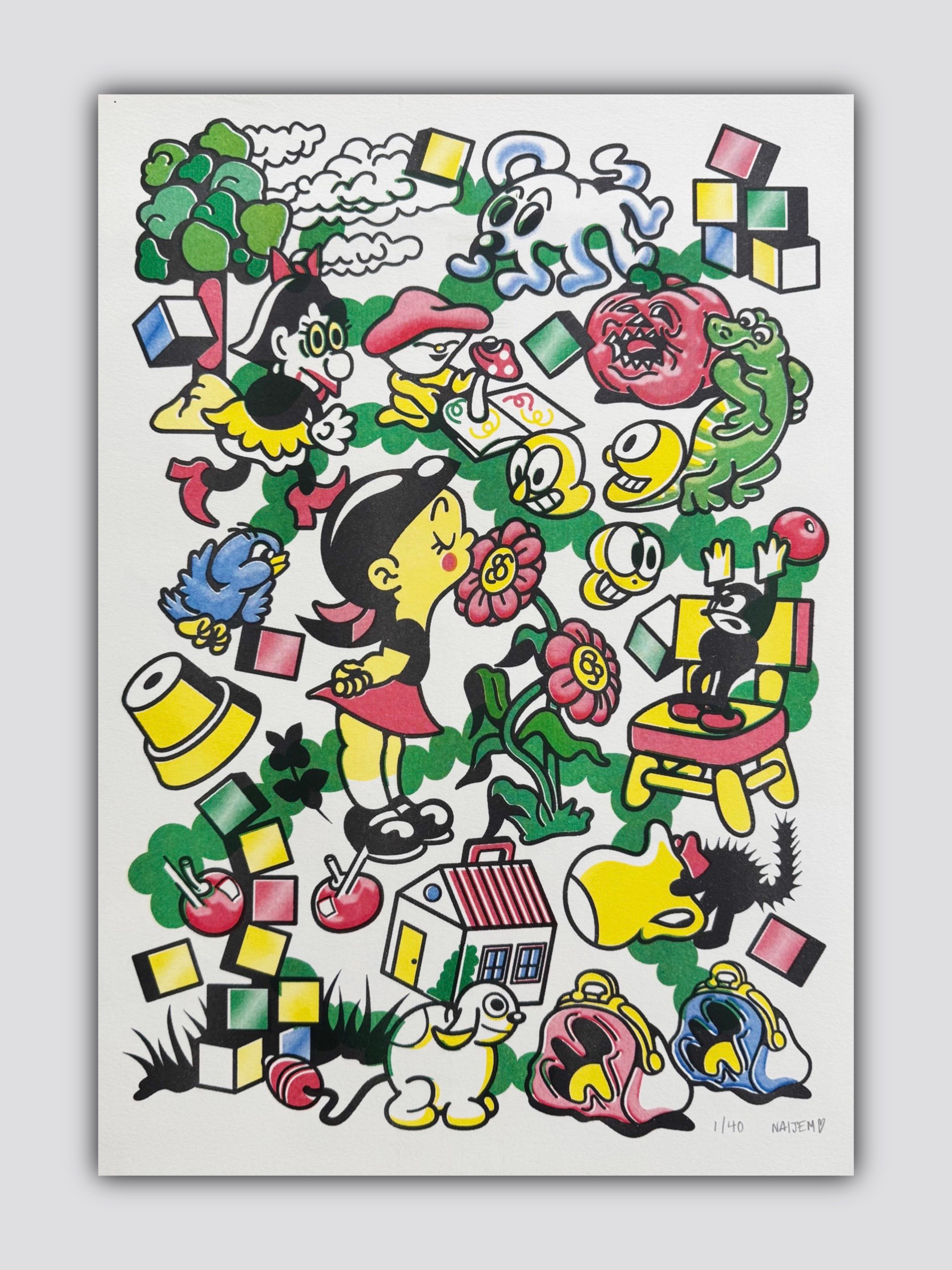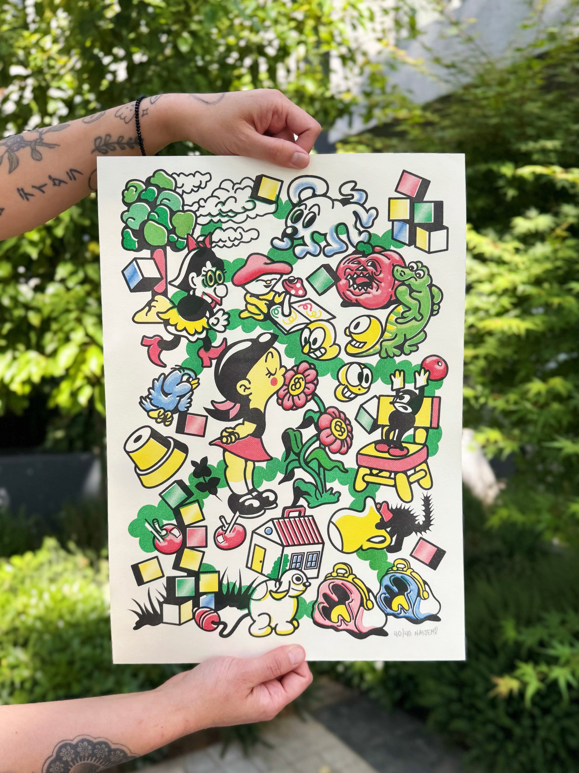 Ilustrado por Naijem Risografía de 5 tintas Edición de 40 copias firmadas Tamaño A3 (29,7 x 42 cm) Arena Rough Ivory 120 gr